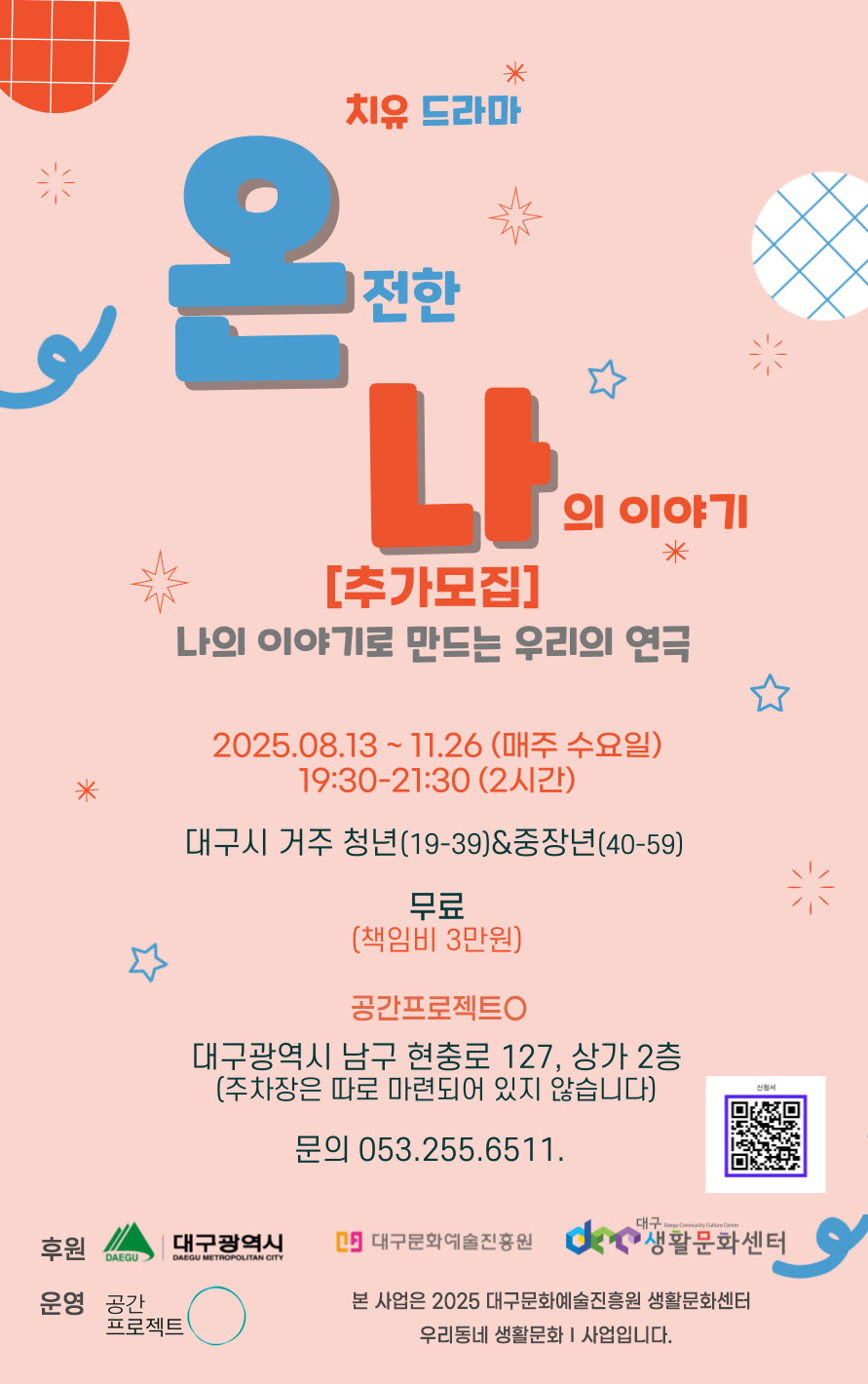 안녕하세요. 놀며,배우며,쉬며,명상하는 공간프로젝트O입니다. 공간프로젝트O에서는 2025년 대구생활문화육성지원사업으로 대구시민의...