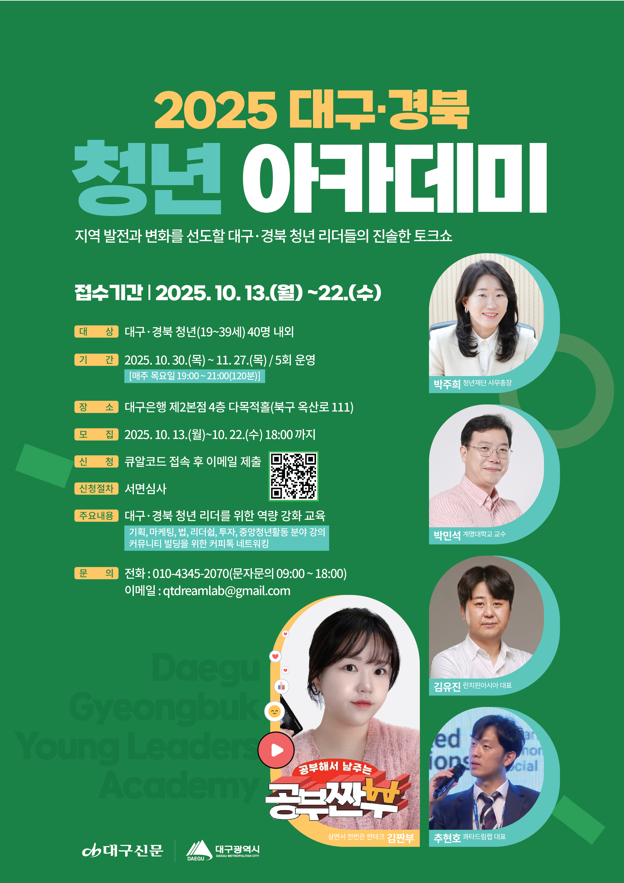 2025「대구·경북 청년 아카데미」 참여청년 모집 공고 대구광역시와 대구신문(주)에서는 대구 경북 청년들을 대상으로 지역 현안을 이해하고 글로벌 소...