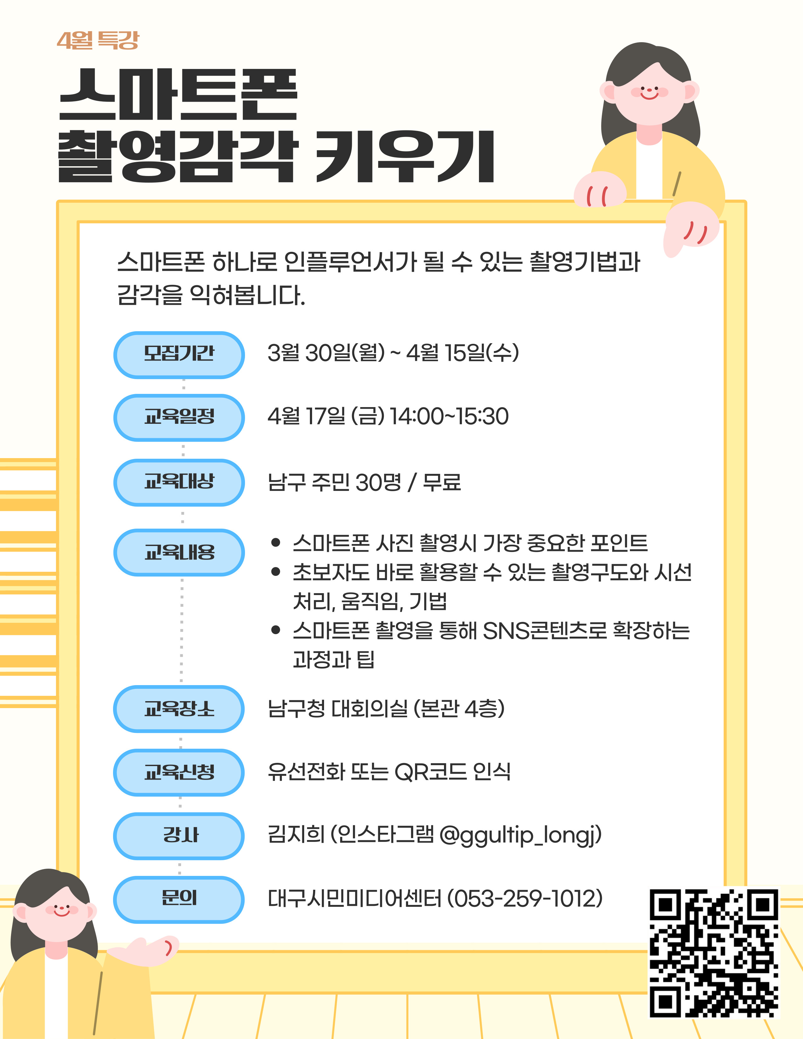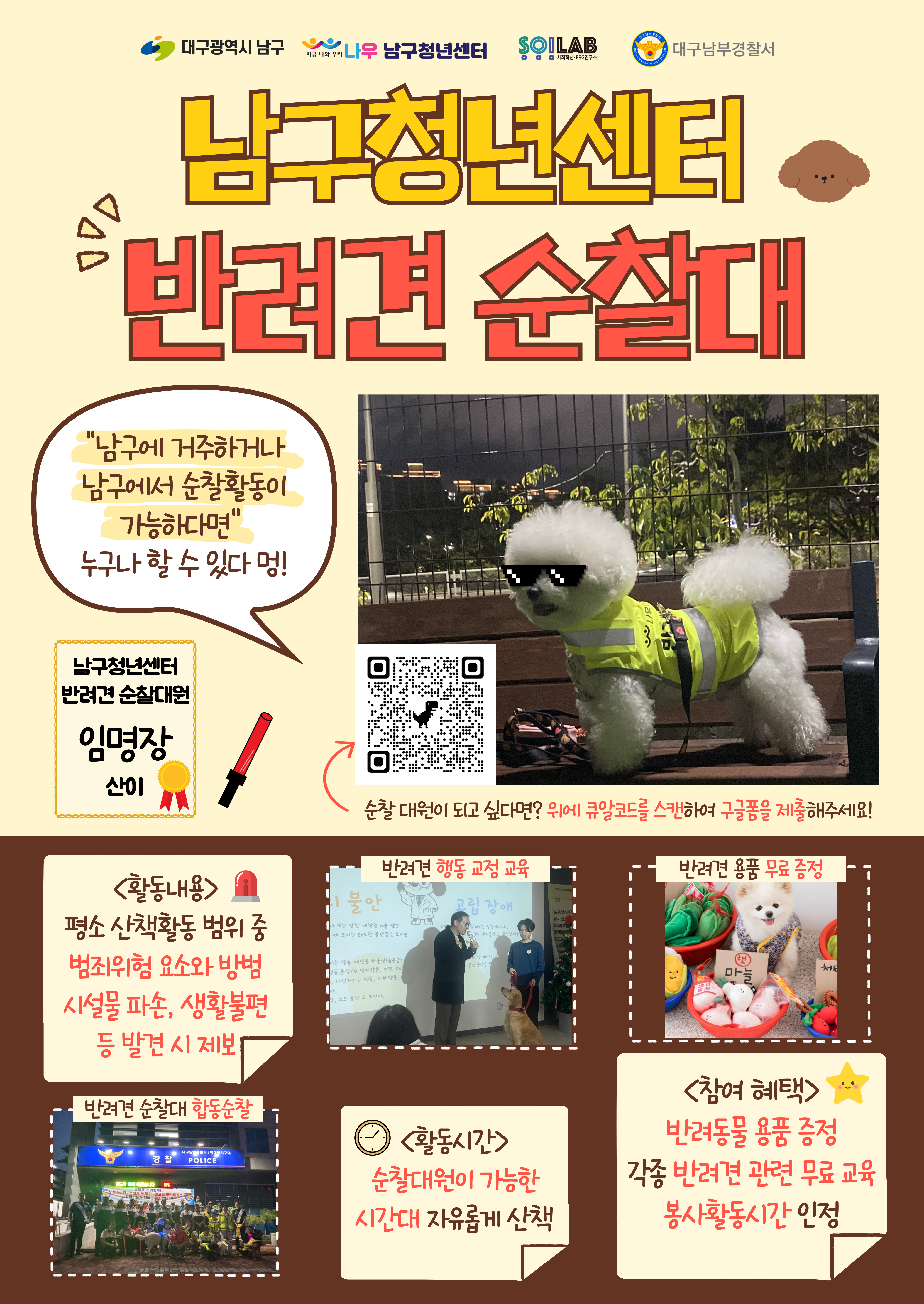 추가적으로 궁금한 사항이 있으시다면 QNA 게시판 또는 편하신 방법으로 문의 부탁 드립니다. 주소. 대구광역시 남구 봉덕남로 99, 1F 남구청년센터 대표번호. 053 - 473 - 2023 이메일. namgu2023@gmail.com 인스타그램. youth_namgu