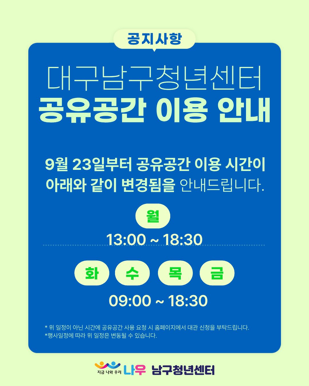 9월 23일부터 대구남구청년센터 공유공간 이용 시간이 변경됩니다! 이용에 참고 부탁드립니다 😊