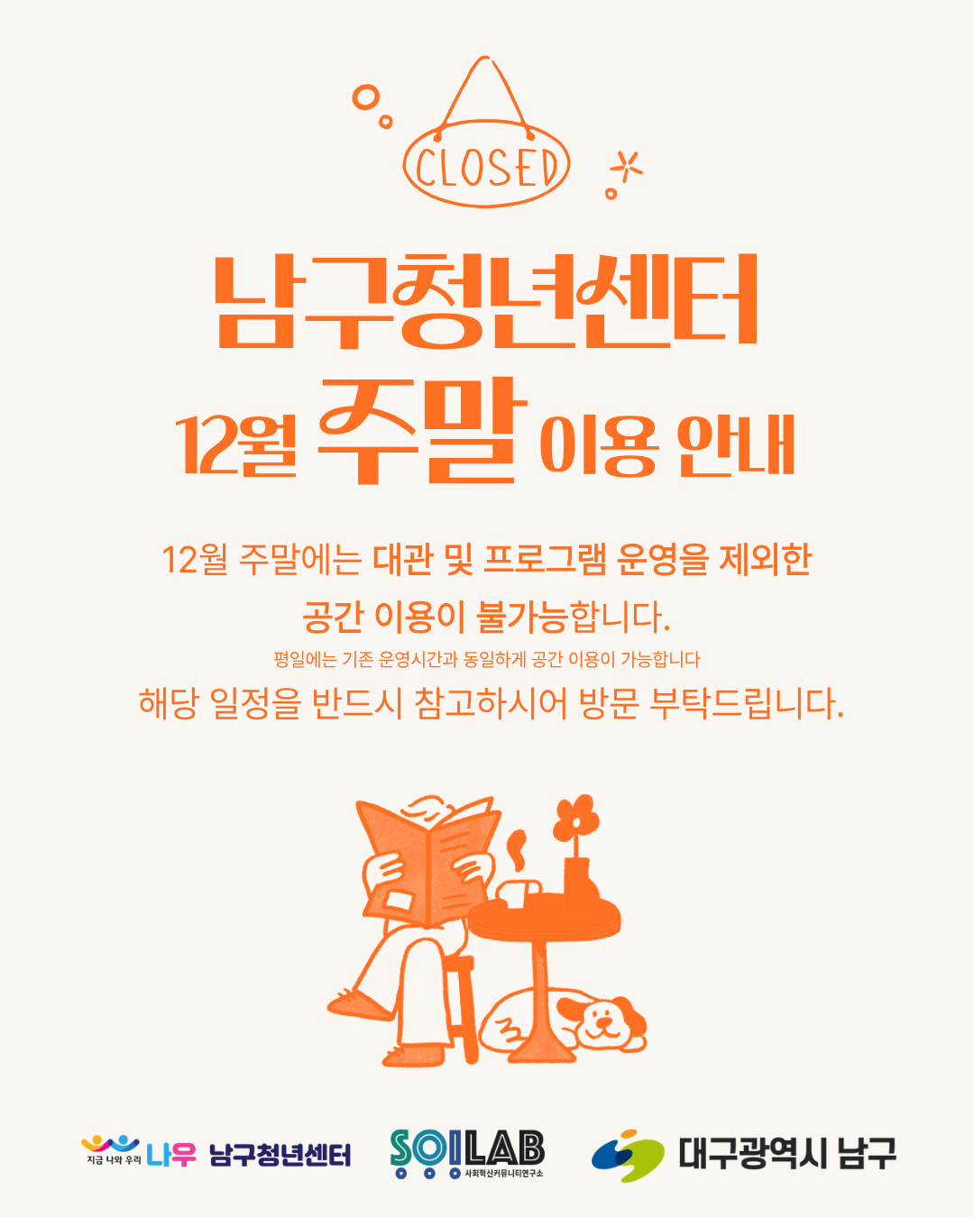 📢 [남구청년센터 12월 주말 운영 안내] 남구청년센터는 12월 주말 동안 대관 및 프로그램 운영을 제외한 공간 이용이 제한됩니다. 평일에는 기존 운영시간과 동일하게 이용 가능하오니 참고해 주세요! 방문 전 일정을 꼭 확인하시기 바랍니다 😊