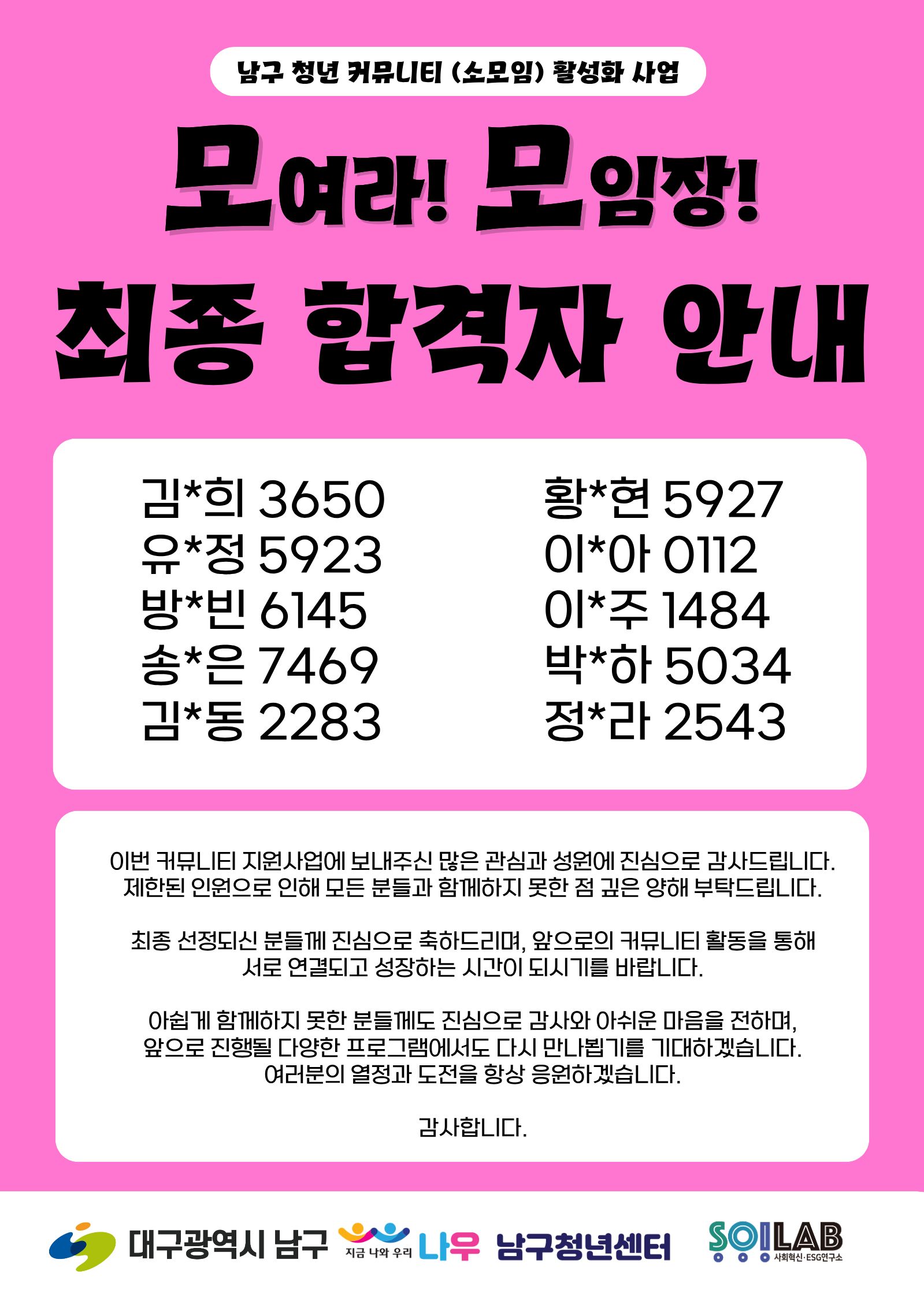 📢 [남구 청년 커뮤니티 ‘모여라 모임장’ 최종 합격자 발표]