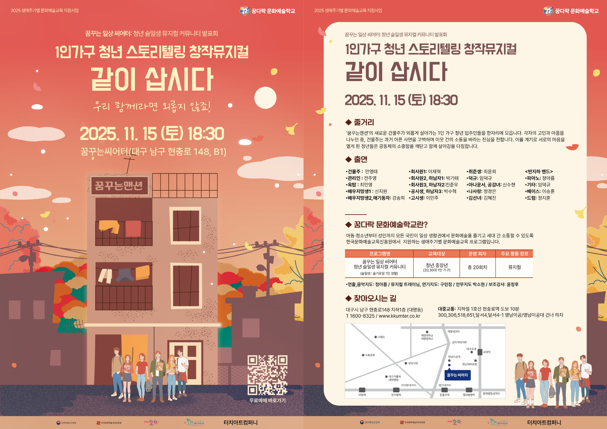 '청년 1인 가구 문제', '앞산 빨래터'와 같이 우리 주변의 이야기를 소재로 지역 예술인과 주민이 연결되어 깊은 공감과 울림을 주는 두 편의 작품을 만나보세요!