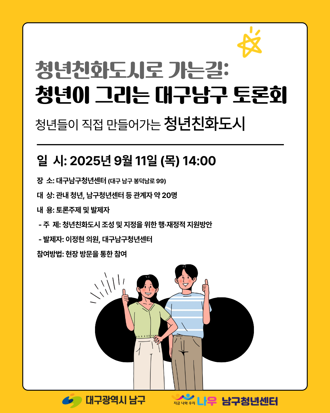 📢 청년친화도시로 가는 길, 청년이 그리는 대구남구 토론회 청년들이 직접 만들어가는 청년친화도시 🌱 우리의 목소리가 정책이 되는 순간! ✨ 일...