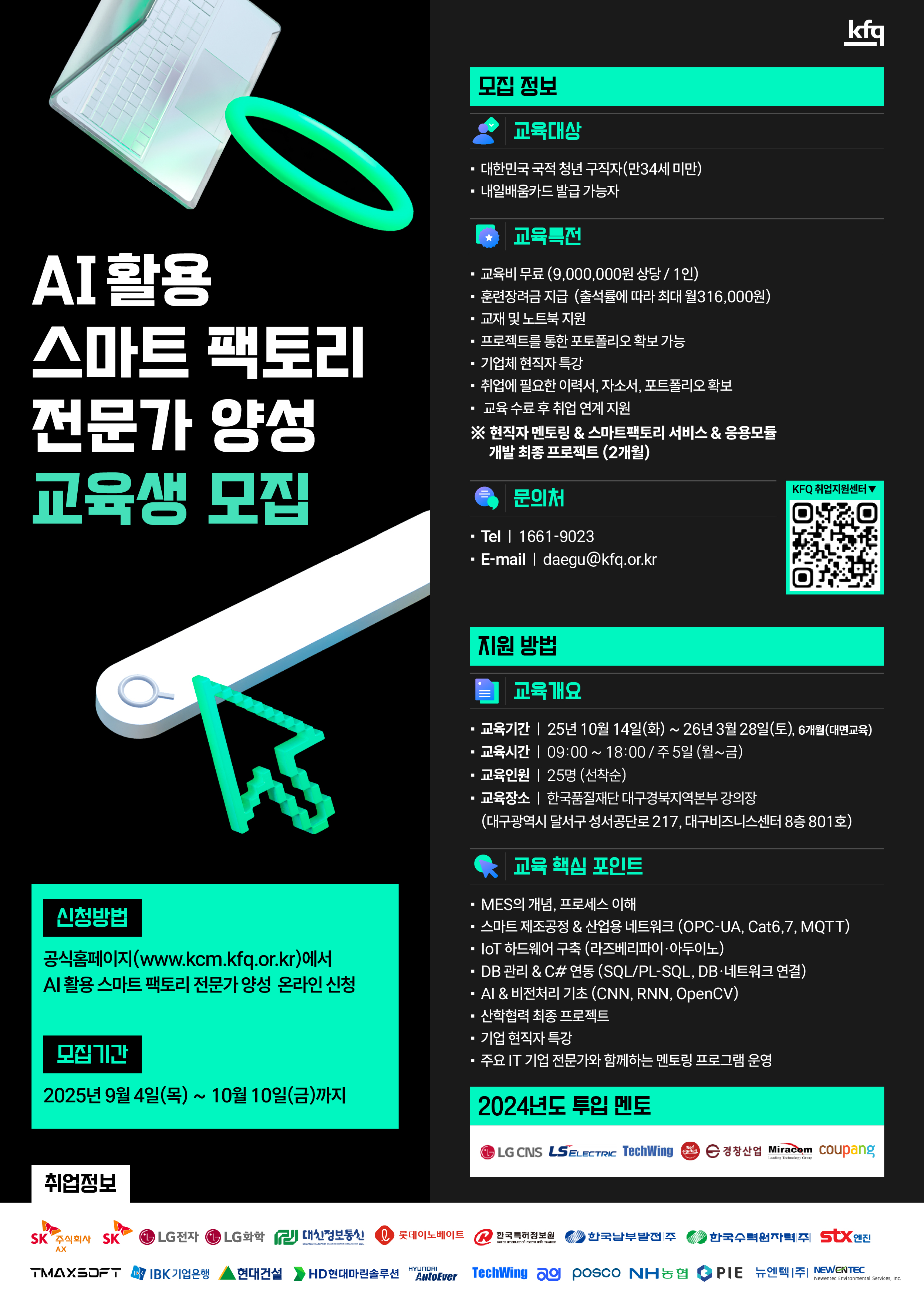 [대구][한국품질재단]AI활용 스마트 팩토리 전문가 양성교육생 모집! 약1000만원 상당의 교육비 전액무료로 진행! 훈련장려금과 교재 및 물품 지원! ...
